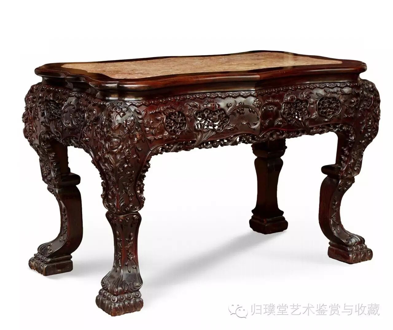 民国·广作《红木嵌大理石束腰西番莲纹长桌》